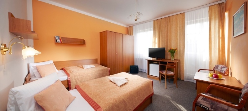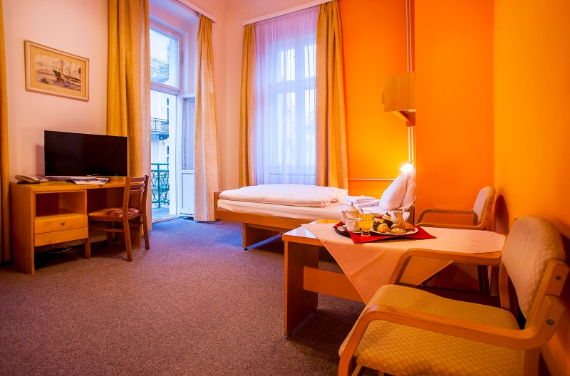 Comfort: 20 – 30 m², vyšší kategorie hotelového pokoje, výhled do klidné lázeňské ulice, některé pokoje mají balkon, koupelna, WC, TV a trezor