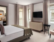 Dvoulůžkový superior s balkónem: 20-24m², vlastní koupelna se sprchou, fénem, WC, TV, trezor, klimatizace, varná konvice, župan a papuče. Výhled do boční lázeňské ulice nebo na hlavní chod hotelu.