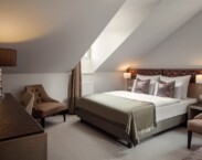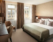 Dvoulůžkový superior: 20m²+, vlastní koupelna se sprchou, fénem, WC, TV, trezor, klimatizace, varná konvice, župan a papuče. Výhled do boční lázeňské ulice nebo na město.