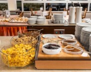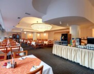 Snídaně, obědy i večeře jsou podávány formou bufetu, možnost dietní stravy. Hotelová kavárna s letní terasou.