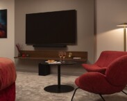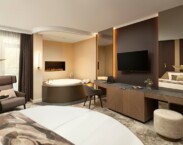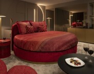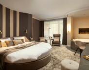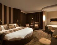 King superior: koupelna a WC, LCD TV, minibar, telefonem, bezplatným WiFi připojením k internetu, trezorem, fénem, županem, balkonem a klimatizací, oválná postel o průměru 230 cm, přímo v pokoji je zabudován whirlpool, 37 m².